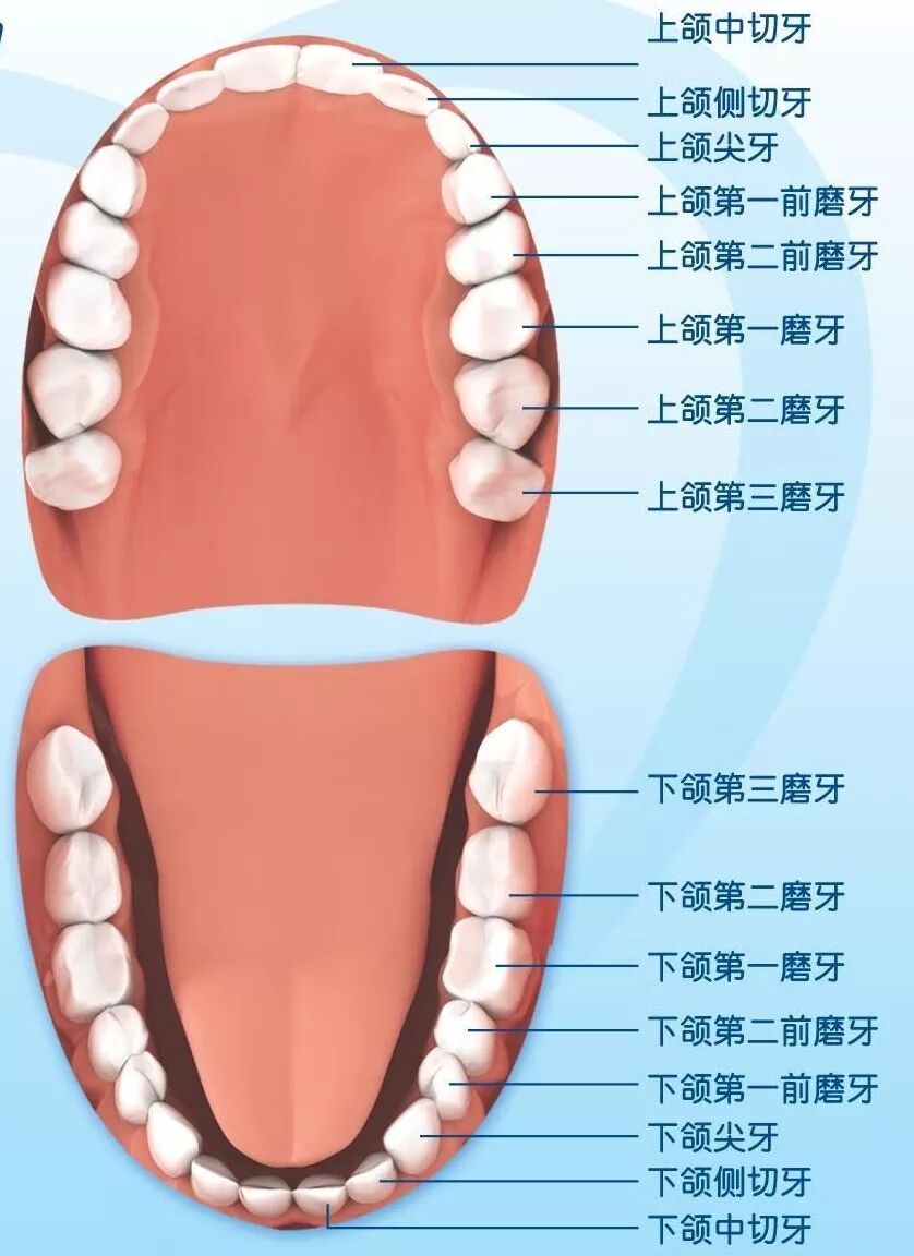 恒牙萌出:随着乳牙一个个地脱落,恒牙便跟着一个个地萌出。(共28颗)